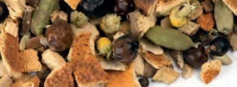 pomarančna lupina, koščki ingverja, koščki cimeta, poper, sladki koren, brinove jagode, zeleni kardamom, kamilica, korenina angelike; začinjen, cimetov, sladkast okus
